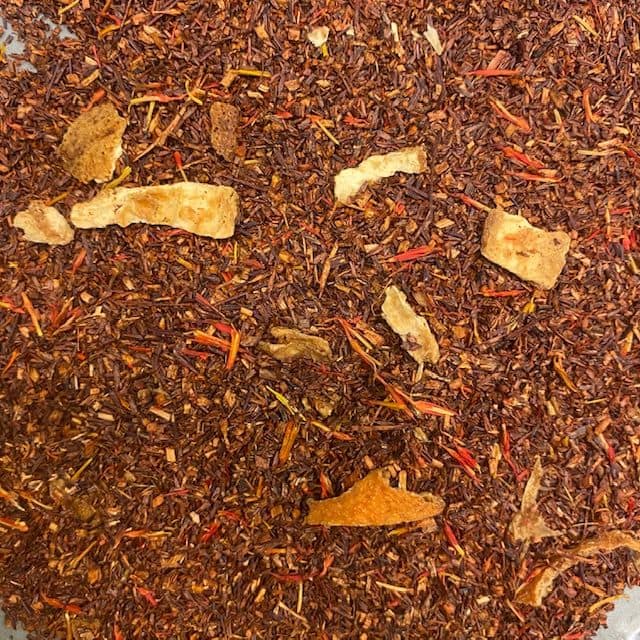 Rooibos bloedsinaasappel, met ingredienten : sinaasappelschil en saffloerbloesem.
