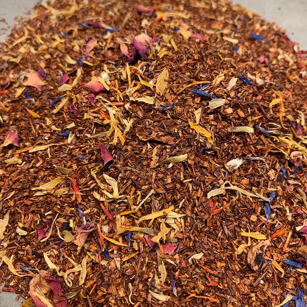 De naam rooibos bloesem zegt voldoende met ingredienten als korenbloembloesem, rozenbloesem, saffloerbloesem en zonnenbloembloesem.