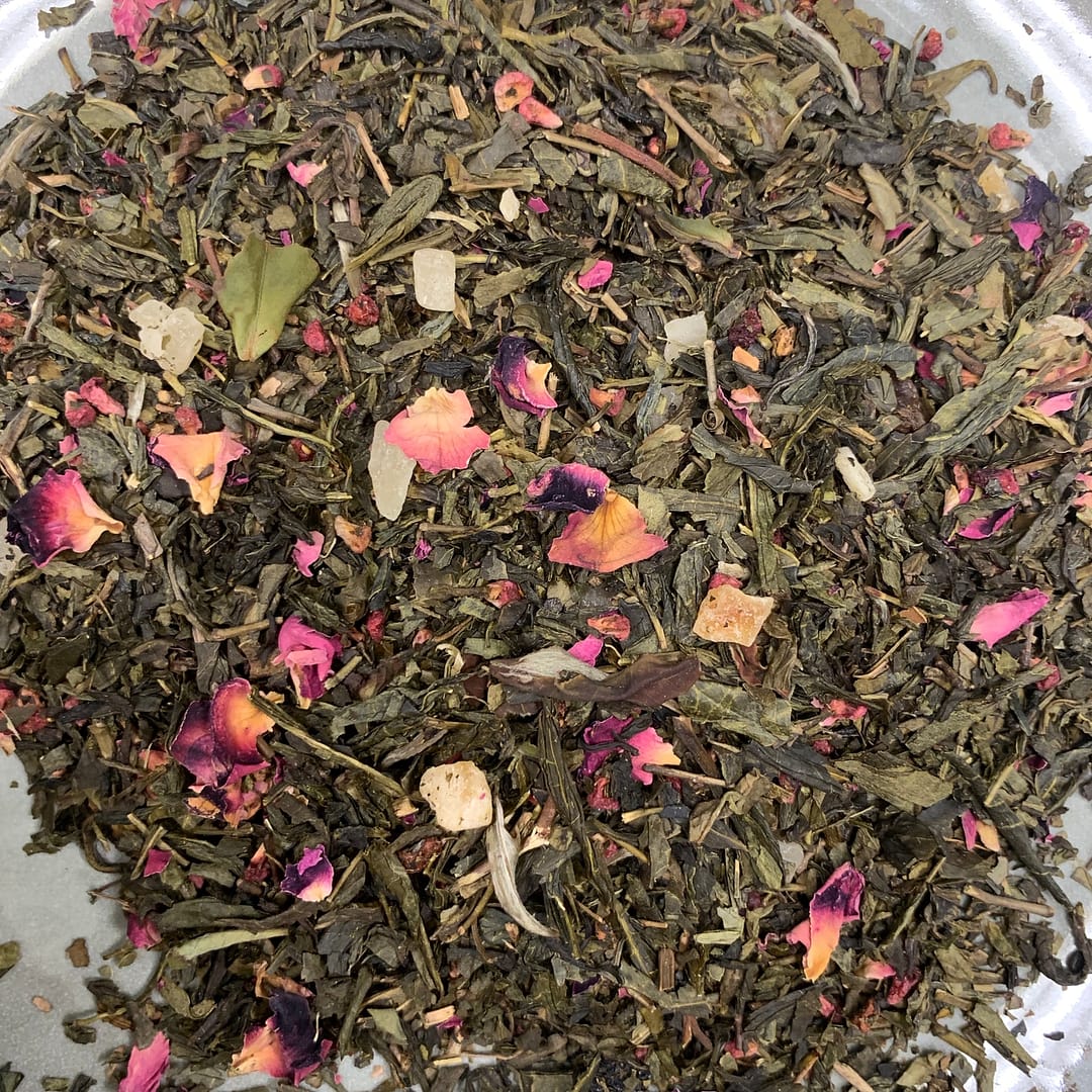 Sencha Lucky Green is groen fruitige thee met aardbei, ananas, framboos, papaya en druiven.
