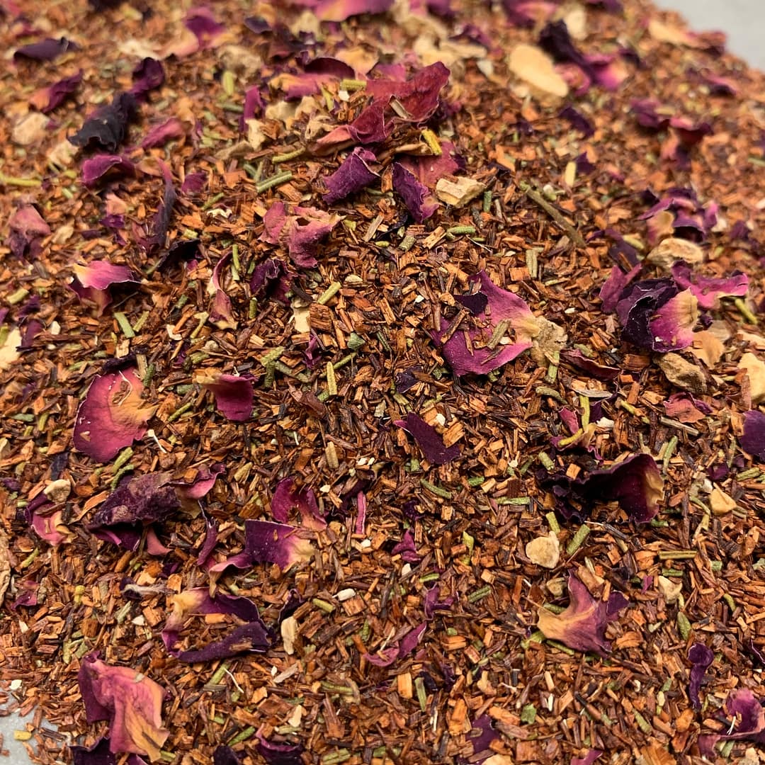 Rooibos Rozemarijn heeft de mooie, smaakvolle combinatie van rozemarijn, rozenblaadjes en gember. Zoet en fris tegelijk in 1 kopje thee.