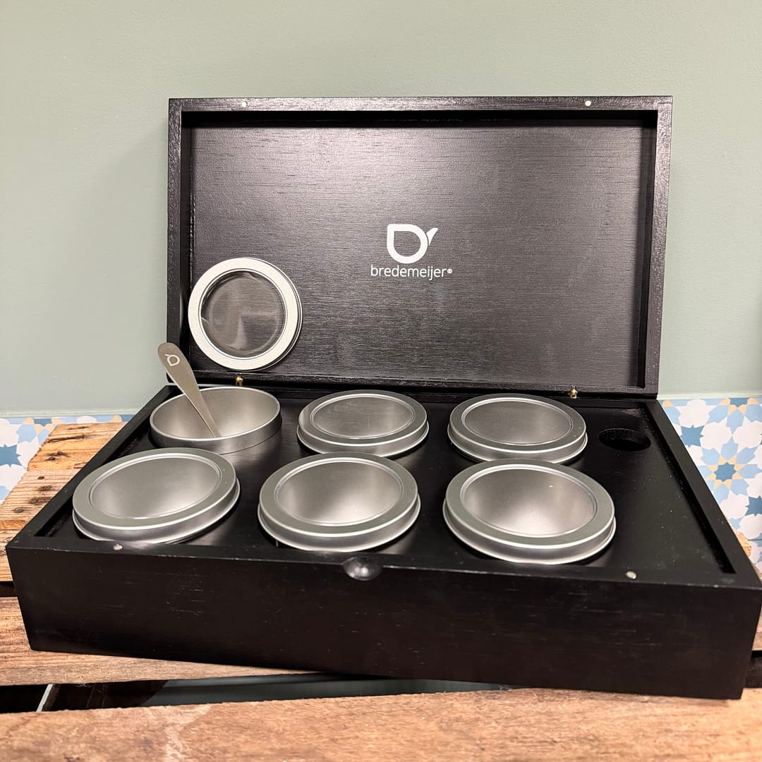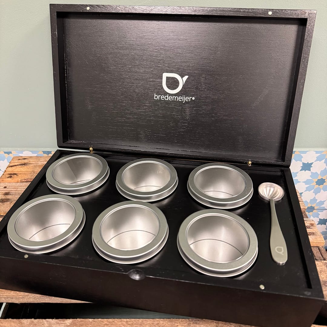 Zes theeblikjes met transparant deksel en maatschepje.