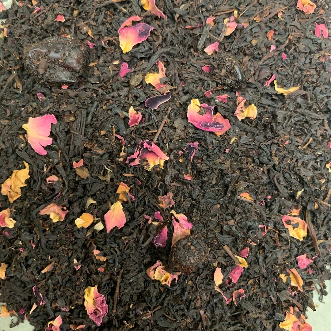 Zwarte verjaardag thee met cranberry's en rozenblaadjes