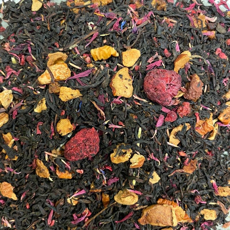 Zwarte thee Framboos met gevriesdroogde frambozen en appelstukjes.